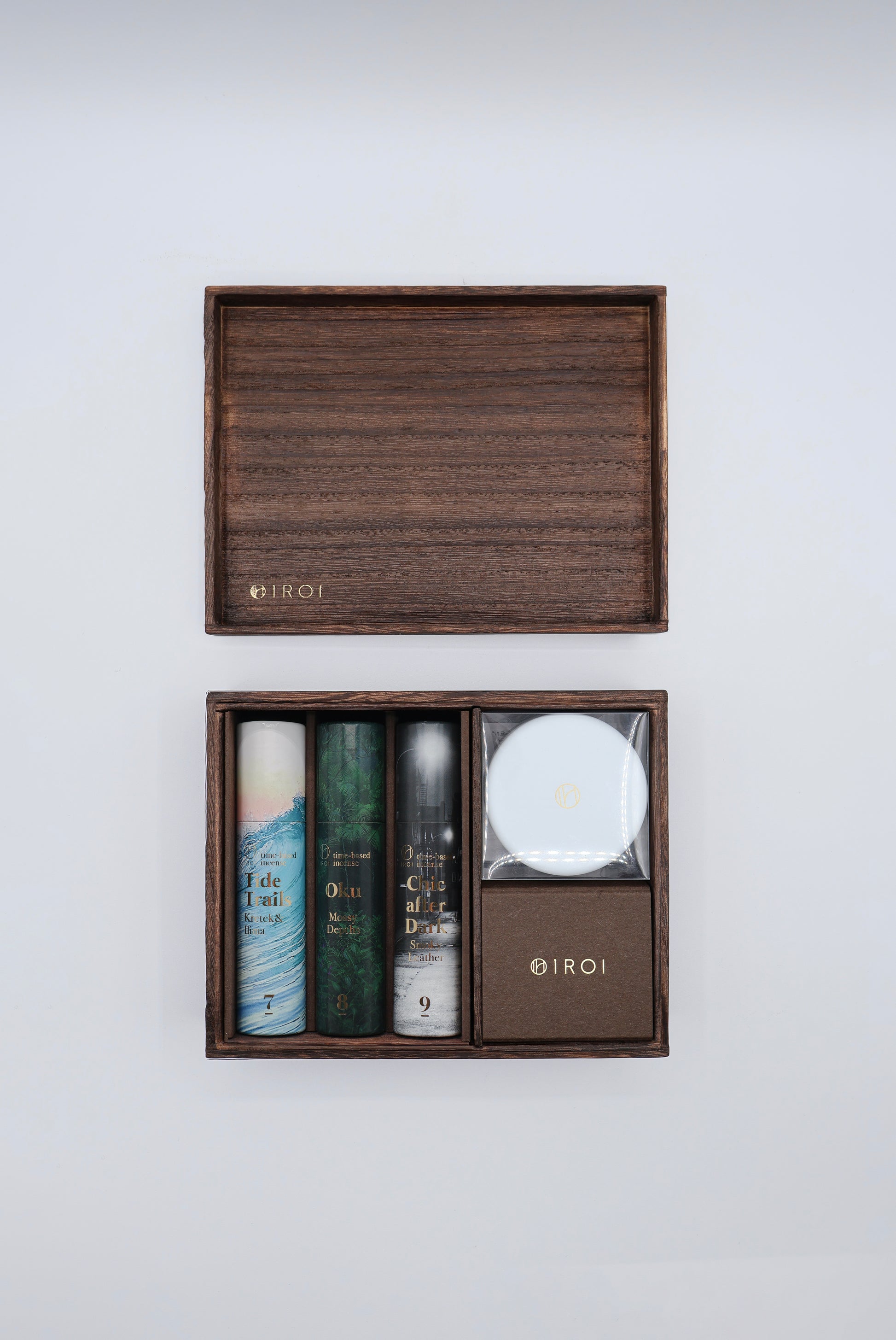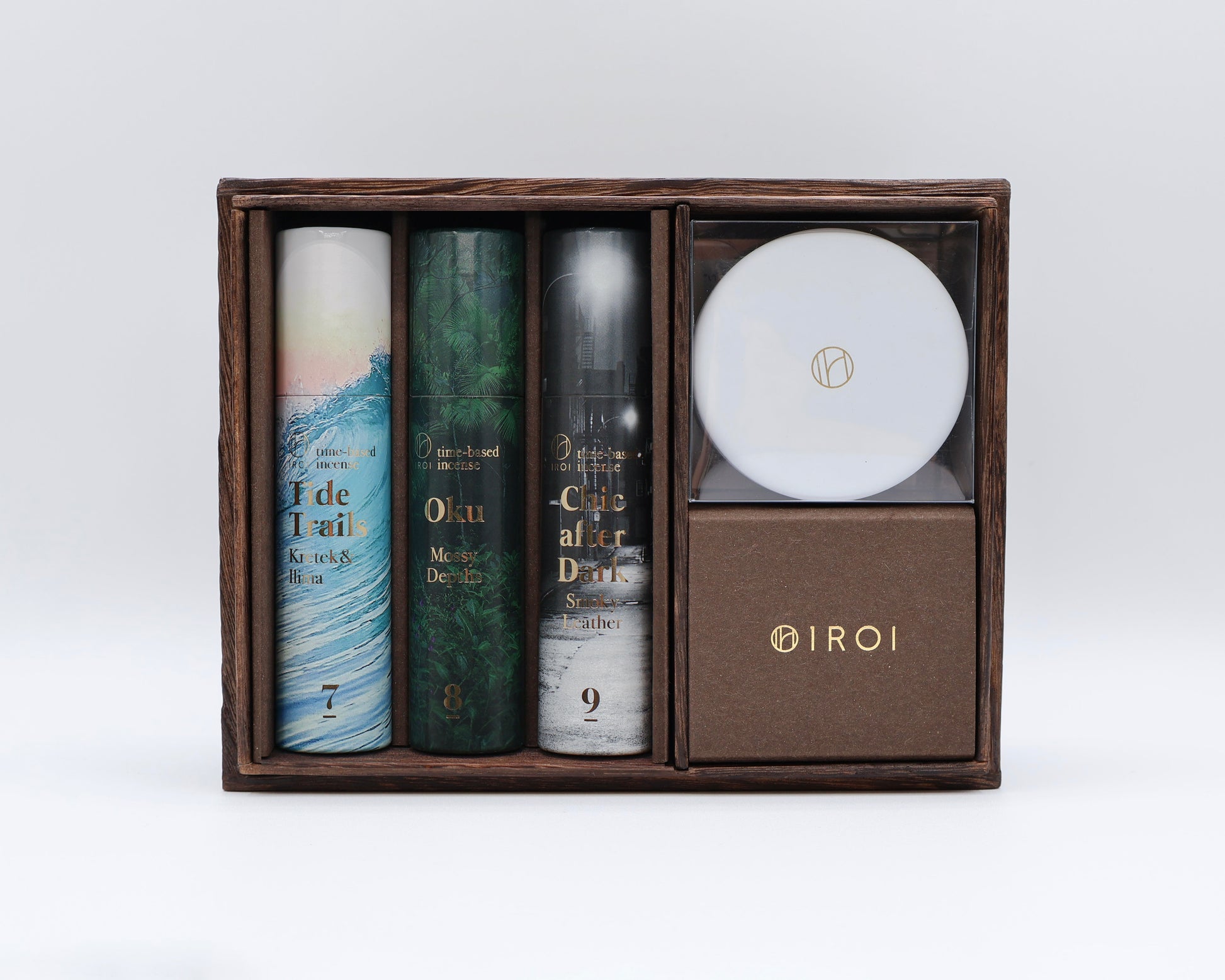 &旅行軸で用途を提案するNo.7~9のインセンス3種類と缶香炉がオリジナルの香箱に入ったギフトセット。